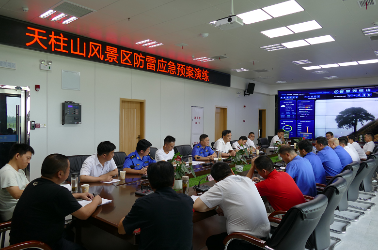 演練開始前,天柱山景區(qū)防雷應(yīng)急演練指揮部在天柱山博物館智慧旅游指揮中心大廳召開了演練部署會(huì)。